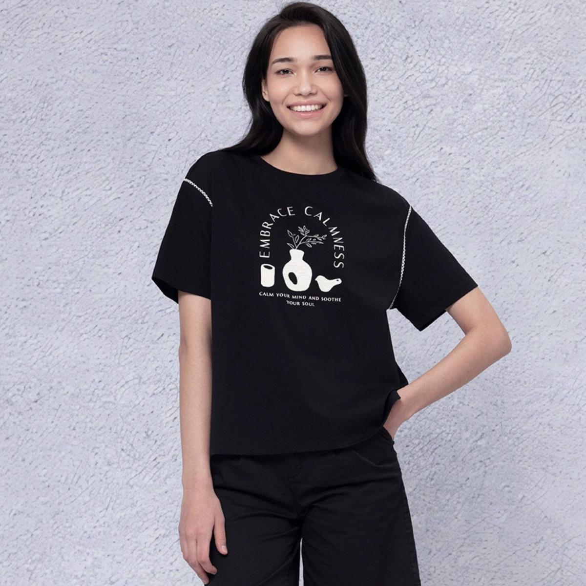 - This is a women's comfortable, short-sleeve t-shirt made from a cotton and polyester jersey fabric. It features a classic crew neck, a relaxed boyfriend fit, and a printed design, offering a soft feel for everyday wear.